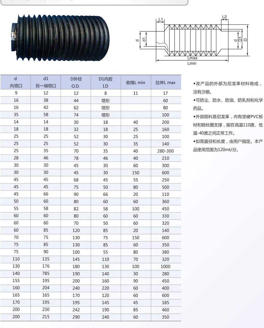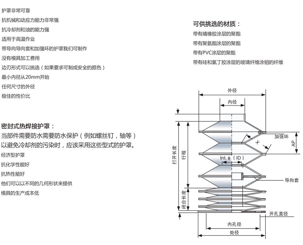 鋼圈支撐的絲杠防護罩,此種護罩采用多種面料,內(nèi)有堅硬的鋼絲圈支撐、能在高溫110℃、低溫-40℃之間正常工作?捎行У姆缐m、防水、防油、防乳劑和化學(xué)藥品,外形工整,不易變形,基于它的嚴密,堅挺,此護罩且可用于眾多機械的通風(fēng)、除塵等。本產(chǎn)品的靈活不但在材料可選,更在于它可以根據(jù)的具體要求來確定所需直徑和長度